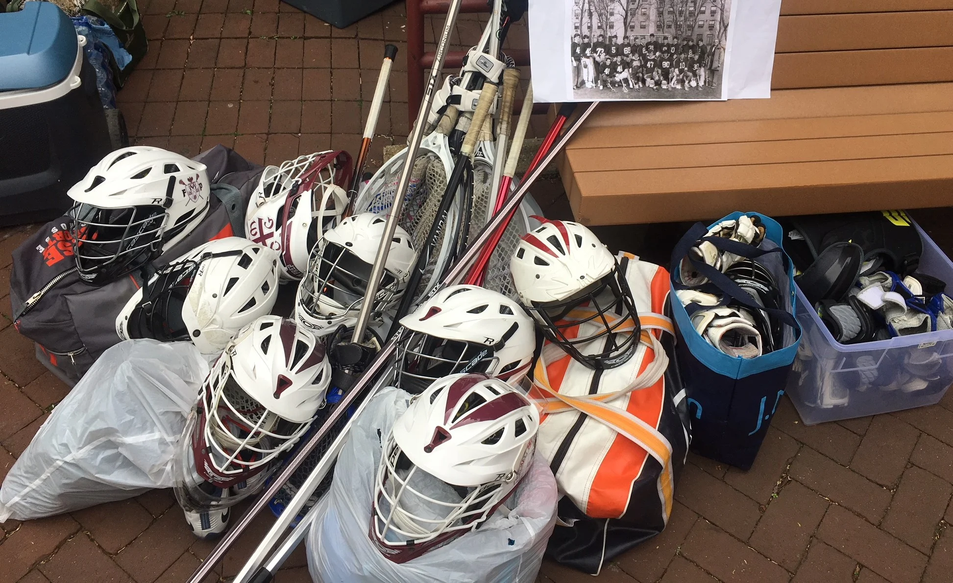 27 lacrosse heads, 24 helmets, 18 pairs of arm pads, 17 pairs of gloves, 14 complete lacrosse sticks, 12 lacrosse jerseys/shorts, 10 lacrosse shorts, 8 pairs of cleats, 7 short stick lacrosse shafts, 6 goalie chest protectors, 5 lacrosse bags, 5 complete goalie sticks, 4 D-Poles, 4 sets of shoulder pads, 3 goalie heads (strung), 3 girls sticks (awesome for an all boys school!), 2 extra goalie throat guards, brand new goalie pants and cup.